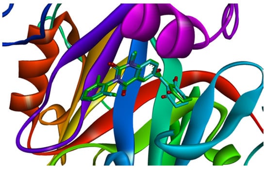 Ligand compared by the glide method. Redocked ligand was green and the native ligand in the crystallographic complex was blue.