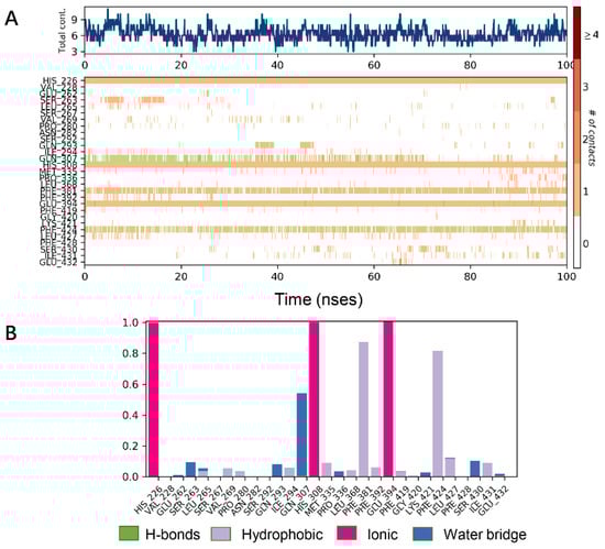 Molecular dynamics (MD) simulations results of 5YY6 protein and its ligand benquitrione. (A) Protein–ligand contacts; (B) bar charts of protein–ligand (P–L) contacts.
