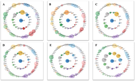 Protein–ligand contacts are represented by asteroid plot. The asteroid plot of AtHPPD co-crystal structure RCSB PDB database (PDB) code: (A) 1TG5, (B) 1TFZ, (C) 5YWH, (D) 5YWK, (E) 5YY6 and (F) 5XGK). Co-crystal ligand in the center is denoted as blue node. The residues in the inner and outer circle represent directly and indirectly contacting residues, respectively. Size of the circle indicates the number of atomic contacts and the residues are colored according to their secondary structures.