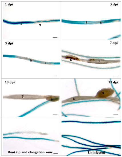GUS expression in RbohB::GUS transgenic line infected with H. schachtii. Shown are infection sites at 1, 3, 5, 7, 10 and 15 dpi of roots grown on Knop medium as well as uninfected roots and root tips with elongation zone. Downregulation of GUS expression at infection sites starts as early as 1 dpi. S, syncytium; N, nematode. Bar = 100 μm.