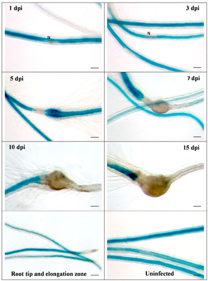 GUS expression in RbohB::GUS transgenic line infected with M. incognita. Shown are infection sites at 1, 3, 5, 7, 10 and 15 dpi of roots grown on Knop medium as well as uninfected roots and root tips with elongation zone. Downregulation of GUS expression at infection sites is clearly visible at 5 dpi. There was no GUS expression in galls at 7, 10 and 15 dpi. N, nematode. Bar = 100 μm.