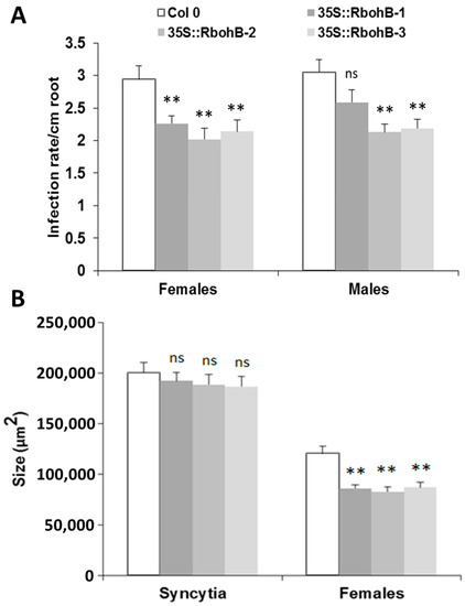 H. schachtii resistance test. The resistance of overexpression lines of RbohB was compared to wild type plants after infection with H. schachtii. (A), Number of male and female nematodes per cm of root length, calculated at 15 dpi. Infection rate is shown in column sets, with asterisks indicating significant differences (** p < 0.05; ANOVA and LSD). The statistical significance was determined by three independent replicates. Values are means ± SE, n = 15. The bar shows standard error for the mean. Ns, not significant (B), Size of female syncytia and female nematodes at 14 dpi. Five syncytia were selected randomly from three independent replicates (total = 15) and the size of syncytia and associated female nematodes were measured. Data were analyzed for significance difference using ANOVA (p < 0.05) and LSD. Values are means ± SE.