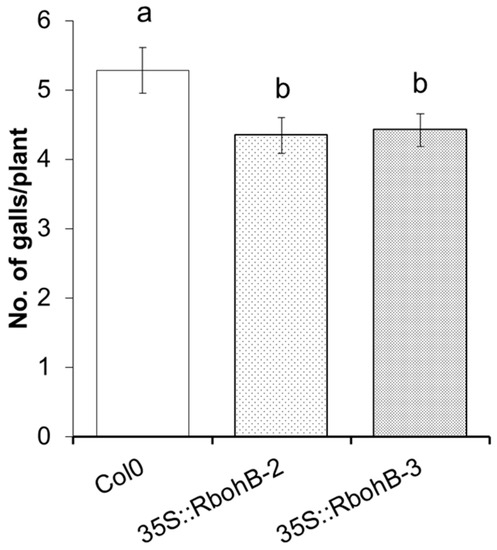 M. incognita resistance test. The resistance of two overexpression lines of RbohB was compared to wild type plants after infection with M. incognita. Number of galls per roots were counted at 15 dpi with different letters “a” and “b” indicating significant difference (p < 0.05; ANOVA and LSD). The statistical significance was determined by three independent replicates. Values are means ± SE, n = 12.
