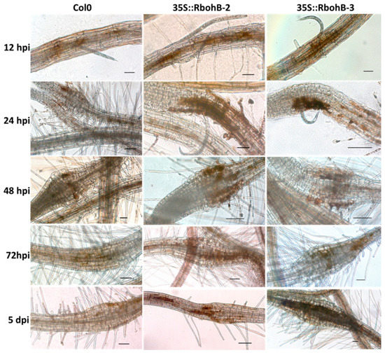 Reactive oxygen species (ROS) production. DAB (3, 3-diaminobenzidine) staining of infection sites of M. incognita in wild type and overexpression lines of RbohB at different time points after inoculation. Scale bar = 100 µm.
