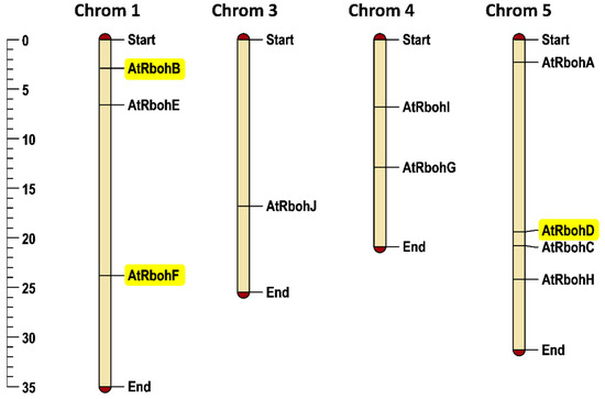 Arabidopsis has 10 Rboh genes, with three genes on chromosome 1 and one gene on chromosome 3. No Rboh gene was found on chromosome 2, while two and four Rboh genes were mapped on chromosomes 4 and 5, respectively. RbohB and RbohF are located on chromosome 1 while RbohD was found on chromosome 5. In general, the chromosomal positioning of Rboh genes (Figure 9) represented uneven distribution in the Arabidopsis genome.