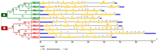 Gene structure analysis of all 10 Rboh genes was performed to compare the intron-exon patterns in their genomic DNA. Members of group A and B showed various similarities in size and relevant positions of introns, exons and untranslated regions (UTRs). For instance, RbohG and RbohC genes from group A and RbohH from group B presented 11 exons of similar size and relevant positions (Figure 10). Similarly, RbohA and RbohB of group A had 12 exons of similar size and relevant prevalence in genomic DNA. We found 14 exons of similar size in both RbohE and RbohF (group B); however, likely due to intronic insertions (RbohF) or deletions (RbohE), the relevant positions of 14 exons were different in both genes. The lowest number of eight exons was found in RbohD. No 5′UTRs were found for the group A genes RbohG and RbohB.