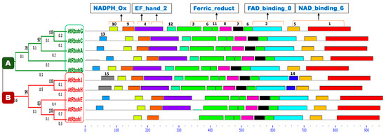 Conserved motif analyses of Rboh proteins. Phylogenetic tree is classified into group A and B, which are labeled with green and red color boxes, respectively. Motif numbers from 1 to 15 with corresponding colors (see also Figure S2) assigned by the MEME suite tool are indicated at top of each motif. Motifs’ heights depict the significance of match, whereas motifs’ widths display the number of amino acids in the respective motif. Characteristic domains corresponding to motifs are indicated at the top of the figure. Rboh proteins containing EF_hand_2 motifs are highlighted with orange lines on motif 4. The X-axis shows the number of amino acids.