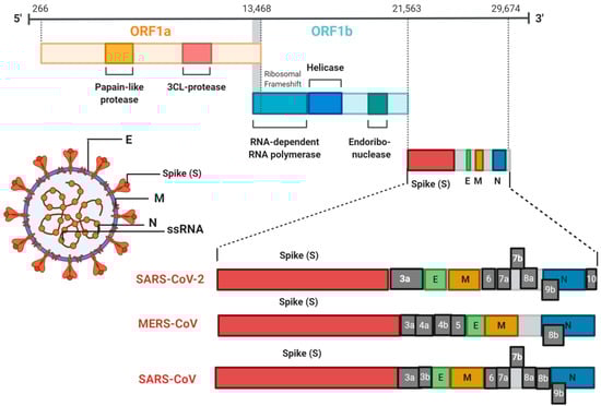 Coronavirus genomic organization. Coronaviruses are enveloped particles 100–160 nm in diameter with a 26–32 kb single stranded RNA (ssRNA) genome. Severe acute respiratory syndrome coronavirus (SARS-CoV), Middle East respiratory syndrome coronavirus (MERS-CoV) and severe acute respiratory syndrome coronavirus 2 (SARS-CoV-2) share a common open reading frame 1 (ORF1)a/b which encodes a polyprotein. The other ORFs are responsible for coding the four main structural proteins: spike (S), envelope (E), membrane (M) and nucleocapsid (N) proteins plus several accessory proteins.