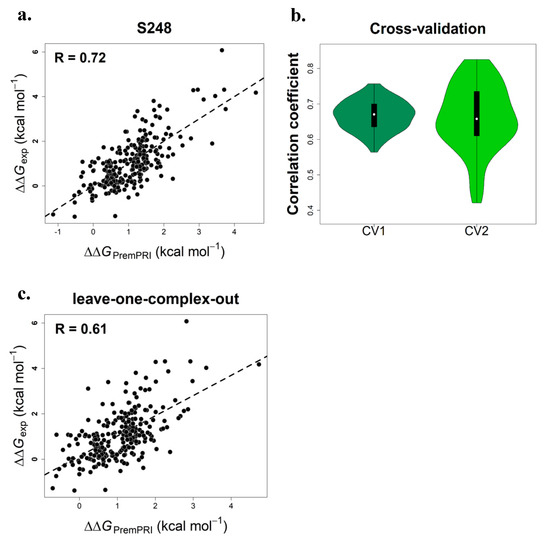 Pearson correlation coefficients between experimental and calculated changes in binding affinity for PremPRI trained and tested on S248 dataset (a), using two types of cross-validation (CV1 and CV2) (b) and performing leave-one-complex-out validation (CV3) (c), respectively.