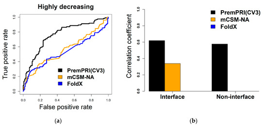 Performance of three methods of PremPRI, mCSM-NA, and FoldX applied to the S248 dataset. The leave-one-complex-out validation (CV3) results of PremPRI are used. (a) ROC curves for predicting highly decreasing mutations. The number of highly decreasing mutations ( ≥ 1 kcal·mol−1) in S248 is 124. (b) Pearson correlation coefficients between predicted and experimental for mutations located at protein–RNA binding interface and noninterface. Only correlation coefficients that are significantly different from zero are shown in the figure (p-value < 0.01, t-test).