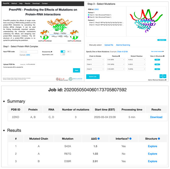 The PremPRI webserver requires the 3D structure of a protein–RNA complex that can be retrieved from the Protein Data Bank with the PDB code input or provided by a file with the atomic coordinates uploaded by the user (Figure 3 and Figure S3a). In either case, the structure file must include at least two chains, one is protein and the other is RNA. After the structure is retrieved correctly, the server will display a 3D view of the complex structure and list the corresponding protein or RNA name for each chain (Figure S3b). As a second step, two interaction partners should be defined, and one or multiple chains can be assigned to each partner. Only assigned chains will be considered during the prediction. As a third step of selecting mutations, three options are provided allowing users to do large-scale mutational scanning (Figure 3 and Figure S3c). In the option of “Specify One or More Mutations Manually”, the user can submit the specified mutations and visualize each mutated site in the protein–RNA complex structure. “Alanine Scanning for Each Chain” option is used to perform alanine scanning for each protein chain. The “Upload Mutation List” option allows users to submit a list of mutations specified in the uploaded file.