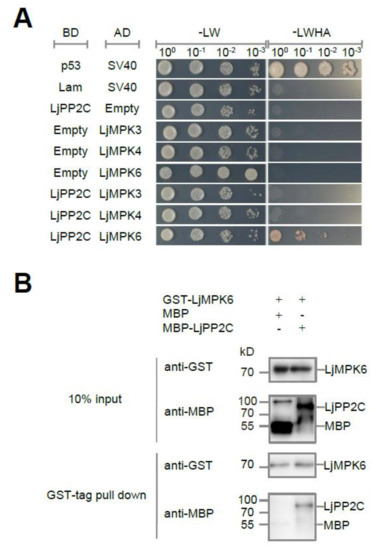 LjPP2C interacts with LjMPK6 in vitro. (A) Yeast two-hybrid assays shows interaction between LjPP2C and LjMPK6. Yeast cells were transformed with AD-LjMPK3/4/6 or BD-LjPP2C vectors. Serially diluted yeast cells were grown on SD-LW (lacking leucine and tryptophan) or SD-LWHA medium (lacking leucine, tryptophan, histidine and adenine). Interactions between p53/SV40 and Lam/SV40 were used as positive and negative controls, respectively. (B) GST pull-down of interaction between LjPP2C and LjMPK6. Positions of MBP-LjPP2C, MBP and GST-LjMPK6 are indicated. MBP-LiPP2C or MBP itself was incubated with GST-LjMPK6 and glutathione resin. After washing, retained proteins were analyzed by SDS-PAGE and immunoblotted with GST and MBP antibodies. +/-, with (+) or without (-) corresponding protein.