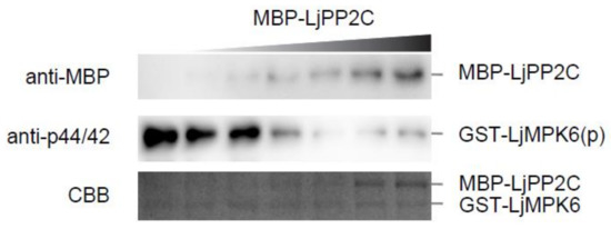 LjPP2C dephosphorylates LjMPK6 in vitro. Phosphorylation of LjMPK6 by SIP2 was performed in advance to prepare phosphorylated GST-tagged LjMPK6. An increasing amount of MBP-LjPP2C was then added to the reaction mixture. MBP-LjPP2C protein was detected by western blotting using anti-MBP antibody. Phosphorylated form of GST-LjMPK6 was detected by anti-p44/42 antibody. CBB, Coomassie Brilliant Blue staining.