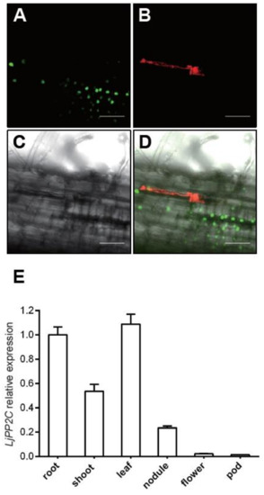 2.2. Expression Pattern of LjPP2C in Both Non-Symbiotic and Symbiotic Tissues