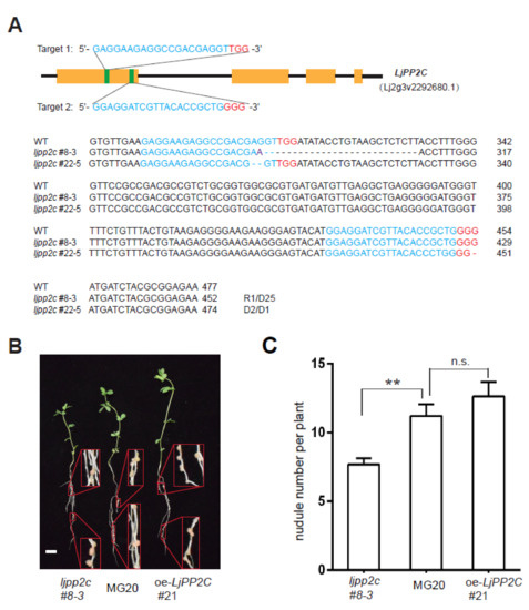 To further explore the regulatory role of LjPP2C in nodulation, we introduced a CRISPR/Cas9-mediated LjPP2C gene knockout construct into Lotus using a stable transformation procedure [26]. In parallel, to generate stable overexpression transgenic plants, we also introduced a LjPP2C overexpression construct in a similar way. Two independent knockout mutants of LjPP2C (ljpp2c#8-3, ljpp2c#22-5) were identified by PCR amplification of the target allele and DNA sequencing (Figure 4A).
