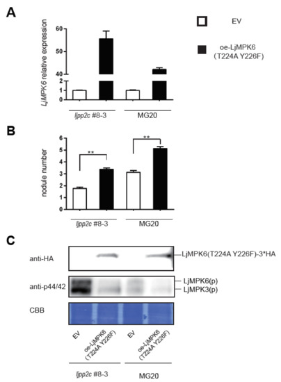 To further ascertain whether or not dephosphorylation of LjMPK6 affects nodule development, we constructed a non-phosphorylatable version of LjMPK6, LjMPK6T224A; Y226F and introduced into wild-type MG20 or the ljpp2c-KO mutant by hairy root transformation (Figure 5A). Compared with the empty vector control, overexpression of LjMPK6T224A; Y226F reduced the phosphorylation of MAPKs in Lotus plants, especially in the ljpp2c-KO mutant background (Figure 5C). Interestingly, compared to empty vector control, nodule numbers were significantly enhanced in LjMPK6T224A; Y226F overexpression hairy roots of both MG20 and ljpp2c#8-3 plants, suggesting that LjMPK6 phosphorylation/dephosphorylation homeostasis indeed plays an important role for nodule organogenesis (Figure 5B).