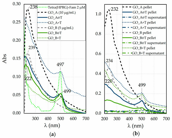 After the centrifugation and washing steps (Figure 1b), the spectra of bare GO demonstrate a different relative ratio of sp3 (oxidized defective) to sp2 (graphitic-like) carbon than the pristine GO, as disclosed both by the hypsochromic shift (~6 nm) of the π → π* peak and by the slight hyperchromic shift in the shoulder related to the n → π* transitions, respectively. In particular, the heavier (and larger) GO nanosheets, which accumulate preferentially in the pellet, exhibit a relative ratio of the sp2 to sp3 domains higher than the lighter (and smaller) nanosheets that mostly gathered into the supernatant, and hence have more defective oxygen-containing groups, especially at the edges [50,51]. To note, an additional contribution to these shifts can derive by the decrease of conjugative effect of chromophore aggregation by washing-induced loss of weakly bound oxygen-containing species, which influences the π–π* plasmon peak [52]. Significantly, the pellets of GO_A@T and GO_B@T samples (Figure 1b), which display spectral features of both GO and Tetra(HPRG)-Fam components, do not show significant changes in the peak wavelength position with respect to those of the hybrid systems before the centrifugation and rinsing steps (Figure 1a). These findings point to the successful and irreversible immobilization of the peptide molecules at the GO nanosheets surface.