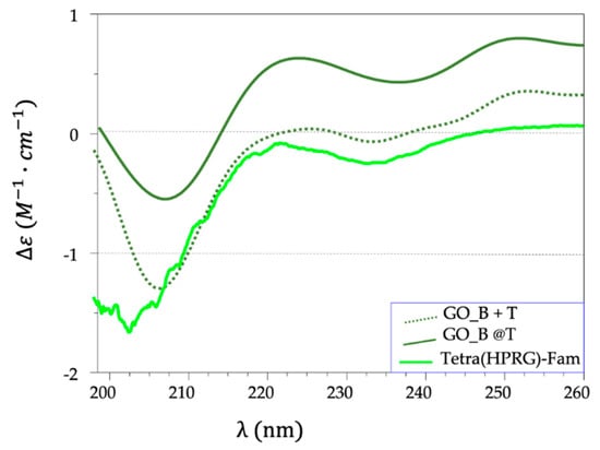 CD spectra in phosphate buffer saline solution (PBS, pH = 7.4) of Tetra(HPRG)-Fam (green, solid line, peptide concentration = 1 × 10−5 M) and the pellets (10× dilution) for hybrid GO_B@T (dark green, solid line) and mixture GO_B+T (dark green, dotted line) samples.