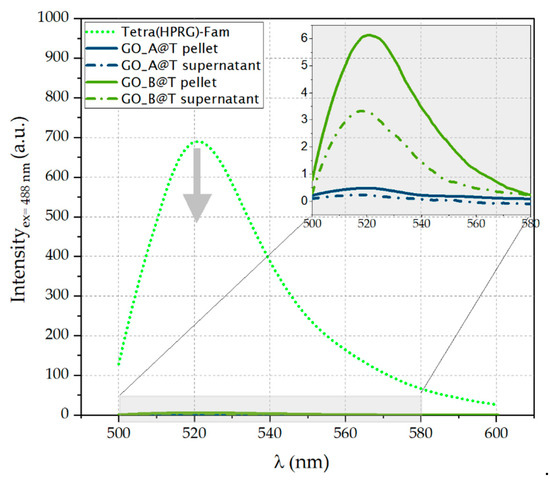 GO, which is itself fluorescent, is a quencher for the fluorescence signals of fluorophores, with a quenching efficiency superior to that of conventional organic molecules [75]. Its quenching mechanism is related either to fluorescence resonance energy transfer (FRET) [76] or photo-induced electron transfer (PET) processes [77]. Hence, when the GO nanosheet and the fluorophore molecules are close to each other, the energy or excited electron transfers from the fluorophore (donor) to the GO (acceptor) and the fluorescence signal of the fluorophore is quenched. GO is largely used as energy acceptor for the fabrication of biosensors [78]. Our findings on the strong quenching of the Fam fluorescence (<99% decrease in the emission intensity measured in the absence of GO) in the GO@T hybrids strongly support the successful and irreversible immobilization of the Tetra(HPRG)-Fam molecules on the GO nanosheets (Figure 3).