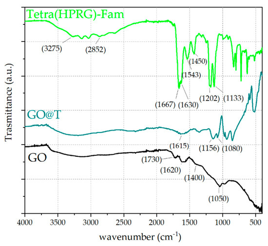 The characterization by ATR-FTIR analyses (Figure 4) confirmed the effective immobilization of the peptide on the GO nanosheets in the hybrid nanocomposite. As to the uncoated GO, the spectrum displays a broad band in the wavenumber range of 3700–3000 cm−1, assigned to O-H stretching vibrations, as well as two peaks at ~1730 cm−1 and 1620 cm−1, due to the C=O stretching of the carboxylic acid groups and the aromatic C–C stretching, respectively [54]. Moreover, a weak signal at ~1400 cm−1 corresponding to the O–H deformation and an absorption peak at ~1050 cm−1 attributed to the alkoxy C–O stretching vibrations are also visible [55,56]. The spectrum of Tetra(HPRG)-Fam shows characteristic peaks from both the 5,6-carboxyfluorescein unit and the peptide backbone. Specifically, the O–H stretching vibrations in the broad band from 3600 to 3300 cm−1 as well as the signals at 1667 cm−1 and 2852 cm−1, which correspond respectively to the stretching of the C=O of carboxyl groups and the C–H stretching [57] are visible, together with the typical IR bands for amino acids and peptide (the “bio-fingerprint region”) at 1630 cm−1 (amide I) and 1543 cm−1 (amide II) are visible [58]. Moreover, the signals at 1202 cm−1 can be assigned to the C=C stretching and the N–H bending vibrations of the histidine residue, while the weak band in range of 1400 and 1465 cm−1 can be attributed to the C–N stretching of the proline and the sharp peak at 1133 cm−1 corresponds to the C–O stretching vibrations of the peptide [59].