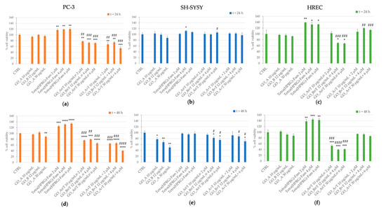 The response of prostate cancer (PC-3), neuroblastoma (SH-SY5Y) and non-tumor endothelial (HREC) cells to the GO@T hybrid nanocomposites was investigated in terms of toxicity through MTT assay. Cell viability assays were performed on cells incubated for 24 h and 48 h with increasing concentrations of GO nanosheets (10, 12, 30 µg/mL), Tetra(HPRG)-Fam (2, 4, 6 µM) and three hybrid (GO@T) and mixture (GO+T) samples, spanning the same concentration range in the GO and the peptide (Figure 5).