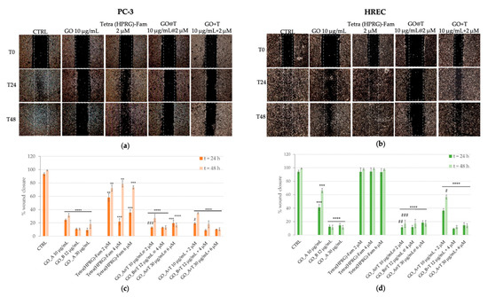 Representative photographs and the quantitative analysis of wound healing for PC-3 (Figure 6a,c) and HREC (Figure 6b,d) incubated in absence (negative control) or in presence of the positive controls of GO nanosheets (10, 12, 30 µg/mL),Tetra(HPRG)-Fam (2, 4, 6 µM) and the corresponding GO+T mixtures are shown in the comparison with those of cells incubated with the hybrid GO@T samples.