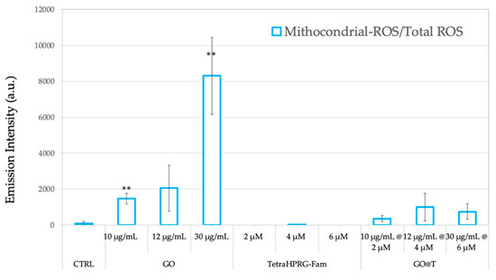 Ratio of mitochondrial-reactive oxygen species (ROS)/total-ROS levels measured on prostate cancer cells (PC-3) measured by the MitoSOX and dichlorohydrofluorescein (DCF) fluorescence assays. Cells were incubated for 24 h in absence (negative control, CTRL) or in presence of the different treatments: GO nanosheets (10, 12, 30 µg/mL), Tetra(HPRG)-Fam peptide (2, 4, 6 µM) and hybrid GO@T samples (10 µg/mL-2 µM, 12 µg/mL-4 µM, 30 µg/mL-6 µM of GO-peptide concentration). Values (means ± SEM) are from three independent experiments. Statistical analysis was performed by One-way ANOVA test. Symbols indicate the significance versus CTRL: ** p < 0.01. Results are expressed as ratio of MitoSOX with respect to DCF emission intensities.