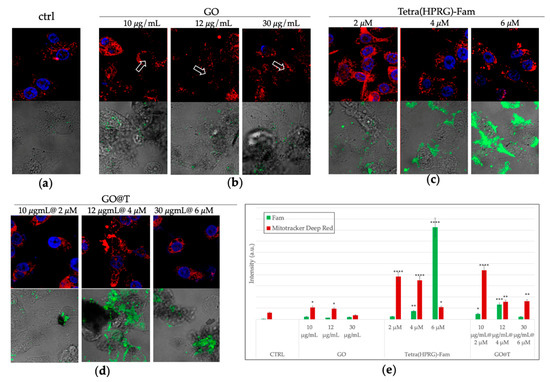 Laser scanning microscopy (LSM) micrographs of PC-3 cells incubated for 24 h in absence (a: CTRL) or in presence of the different treatments: GO nanosheets (b: 10, 12, 30 µg/mL), Tetra(HPRG)-Fam peptide (c: 2, 4, 6 µM) and hybrid GO@T samples (d: 10 µg/mL-2 µM, 12 µg/mL-4 µM, 30 µg/mL-6 µM of GO-peptide concentration). For each treatment condition, the merged confocal images of nuclei (Hoechst, λex/em = 405/425–450 nm) and mitochondria (MitoTracker Deep Red, λex/em = 633/650–700) (upper panel), and the merged fluorescence image of the dye-labelled peptide (Fam, λex/em = 543/550–600 nm) and the optical bright field micrograph (lower panel) are shown. Scale bar 30 µm. The white arrows guide the eye to the GO sheets. In (e): quantitative analysis of Fam and MitoTracker Deep Red emission intensity. Results are presented as mean +/-SEM from experiments in triplicate and normalized with respect to the control untreated cells. Asterisks represent the correlation significant at the (*) p < 0.05, (**) p < 0.01, (***) p < 0.001 (****) p < 0.0001 vs. CTRL, (One-way ANOVA).