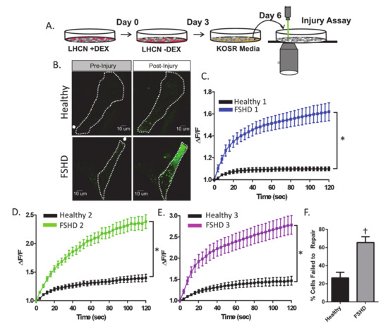 First, we examined plasma membrane repair capacity in immortalized human myoblasts isolated from three individuals with FSHD and their first-degree relatives (Table 1) [32,33]. We have previously described that culturing these FSHD patient cells in normal growth media (LHCN) in the presence of dexamethasone maintains low levels of DUX4, enabling stable maintenance of these cells for extended periods [34]. However, shifting these cells to modified media (containing knockout serum replacement, KOSR) without dexamethasone provides a culture condition that leads to a higher level of endogenous DUX4 expression in FSHD cells [34]. Therefore, we sequentially switched the cultured patient cells from basal to the modified media with dexamethasone to increase endogenous DUX4 expression prior to membrane repair assessment (Figure 1A). To monitor the plasma membrane repair ability of these cells, we used a pulsed laser ablation injury assay in which the cell’s plasma membrane is injured with a 10 ms pulse of a focused laser while incubating in cell impermeant FM1-43 dye [35]. This injury allows the FM1-43 dye to enter the cell upon membrane disruption, causing an increase in fluorescence intensity as FM1-43 binds to the internal membrane [35]. We found that all three FSHD patient myoblasts allowed significantly greater amounts of FM1-43 dye entry into the cytosol, indicating significantly worse repair ability when compared to their unaffected first-degree relatives (significant tx*time interaction p < 0.001 for all three cell lines, Figure 1B–D). This deficit corresponded with a significantly greater percentage of FSHD patient myoblasts failing to repair following injury (p < 0.05 for all three cell lines, Figure 1C–E).