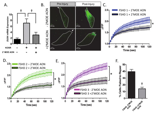 Treatment of FSHD-immortalized myoblasts with antisense oligonucleotides (2′-O-(2-Methoxyethyl)- oligoribonucleotide (2′MOE AON)) targeting DUX4 improves membrane repair. (A) The culturing protocol (three days in LHCN −DEX, three days in 15% KOSR media) significantly increases DUX4 mRNA expression in FSHD muscle cells. 2′MOE AON treatment reduces DUX4 mRNA to baseline levels (n = 3 per cell line). (B) Images of FM1-43 dye entry in injured myoblasts at baseline (pre-injury) and at 120 s post-injury in control FSHD myoblasts, and FSHD myoblasts treated with 100 nM 2′MOE AON. Arrow indicates location of laser injury. (C–E) Change in intracellular FM1-43 dye fluorescent intensity (ΔF/F) over time for control FSHD myoblasts (FSHD1 n = 41 cells, FSHD2 n = 22 cells, FSHD3 n = 37 cells) and FSHD myoblasts treated with 100 nM 2′MOE AON (FSHD1 n = 39 cells, FSHD2 n = 22 cells, FSHD3 n = 33 cells). For all three cell lines, 2′MOE AON treatment significantly improves membrane repair (demonstrated by a significant reduction in dye entry post-injury) (p < 0.05). (F) Percentage of cells that failed to repair with and without 2′ MOE AON treatment across all three cell lines in each condition. Greater dye entry indicates worse repair. Values are mean ± SEM. * indicates significant treatment (+2′MOE AON vs. –2′MOE AON)*time interaction for FM1-43 intensity at p < 0.05. † denotes difference between FSHD myoblasts treated with and without 2′MOE AON, paired t-test, p < 0.05. KOSR = knock-out serum replacement.