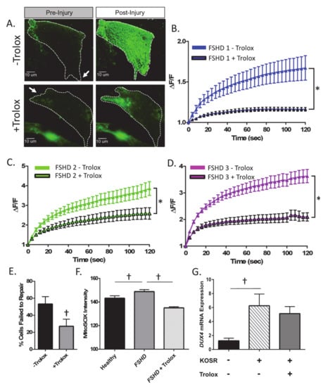 Previous studies have found that oxidative stress compromises membrane repair and plays a central role in the pathophysiology of FSHD [25,27]. In vitro, treatment with antioxidants (e.g., retinoic acid) reduces ROS (via increased transcription of the ROS-scavenger glutathione peroxidase) and apoptosis in response to exogenous oxidative stress (H2O2 exposure) in human FSHD myoblasts, as well as DUX4-induced toxicity in C2C12 myoblasts, suggesting that antioxidant treatment could positively affect plasma membrane repair capacity [38,39]. To investigate if antioxidant treatment is beneficial for repair in FSHD myoblasts, we treated patient cells with Trolox (a water-soluble analog of vitamin E that serves as a ROS scavenger, membrane-associated antioxidant, and membrane-stabilizing agent in vivo) [40,41,42,43] and exposed them to the laser injury assay as described above. We found that 24 h of pre-treatment with Trolox significantly improved membrane repair capacity in all three FSHD-immortalized myoblast lines tested (p < 0.05, Figure 3A′D). Similar to treatment with 2′MOE AON, Trolox also reduced the percentage of cells that failed to repair across all three FSHD cell lines (p < 0.05, Figure 3E). Since Trolox has antioxidant effects, we also assessed myoblasts for levels of mitochondrial ROS using the mitochondrial superoxide indicator MitoSOX. We found that FSHD myoblasts demonstrate significantly elevated levels of mitochondrial ROS, which was mitigated by Trolox treatment (Figure 3F, p < 0.05). While previous studies have shown that antioxidants ameliorate DUX4 toxicity, and that oxidative stress mediates DUX4 expression secondary to activation of the DNA damage repair response, we did not identify any effect of Trolox treatment on DUX4 mRNA expression (p > 0.05, Figure 4G) [23,44]. Taken together, these data suggest that antioxidant treatment may improve plasma membrane repair by reducing mitochondrial ROS levels in FSHD myoblasts independent of any effect on DUX4 expression.