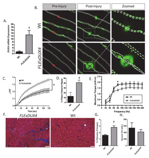 Since myofiber repair deficits were shown to contribute to muscle pathology in other muscular dystrophies [19,20,35], and because we identified repair deficits in FLExDUX4 myofibers, we assessed for additional signs of muscular dystrophy in muscles shown to be highly affected in humans with FSHD (triceps, tibialis anterior (TA)) in the same cohort of FLExDUX4 and Wt mice [49]. We observed a significant interaction between genotype and frequency for TA torque production (p < 0.05, a measure of muscle strength), with FLExDUX4 mice demonstrating reduced torque production at 80 Hz (Figure 4E, p < 0.05) compared to their Wt littermates. We also fit a one-phase association growth model to the torque-frequency curve to determine the rate of rise in torque production as previously described [50]. This analysis revealed that FLExDUX4 mice present with a reduced rate of rise in torque production (FLExDUX4: 0.016 ± 0.0005 vs. Wt: 0.019 ± 0.0006, p < 0.05, expressed in units of inverse frequency). We also identified elevated skeletal muscle fibrosis in the triceps (although overall fibrosis was limited to ~3%) (both p < 0.05, Figure 4F–G) in FLExDUX4 mice compared to their Wt littermates. Serum creatine kinase, a measure of muscle damage or muscle membrane fragility, was not elevated in the FLExDUX4 mice at rest (Figure 4H). These results indicate that FLExDUX4 mice do not demonstrate signs of an unstable sarcolemma at rest (as is the case in other mouse models of muscular dystrophy such as the mdx mouse), but demonstrate deficits in repair following injury, which may contribute to muscle weakness and increased skeletal muscle fibrosis.