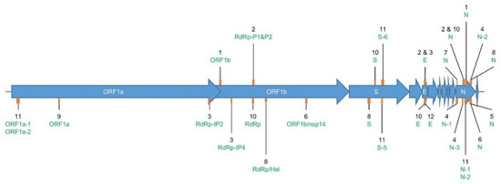 Location of the sequence amplified by each evaluated primer set in Table 2. Genome (NC_045512.2). The SARS-CoV-2 genome (~29,000 nt) is composed of genes coding for structural proteins, such as the Spike protein (S), Envelope protein (E), and Nucleocapsid protein (N); and non-structural proteins located in the Open Reading Frame 1ab (ORF1ab), such as RNA-dependent RNA polymerase (RdRp), Helicase (H), and non-structural protein 14 (nsp14). The orange rectangles in the figure show the approximate size and location in these genes of the target sequence that is amplified by each of the evaluated primer sets. The corresponding assay reference number is indicated in black, and its targeted gene in green (Table 1). Two labels connected to the same orange rectangle indicate that the targeted amplified sequences are overlapping. The exact starting point of each of the forward primers and the length of their corresponding amplicons are available in Table 1.