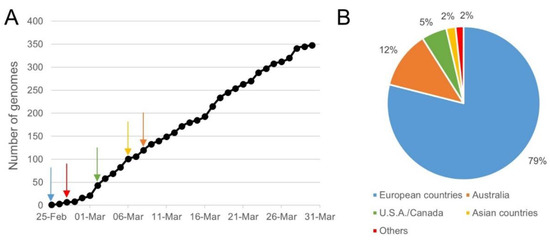 - Phelan, J.; Deelder, W.; Ward, D.; Campino, S.; Hibberd, M.L.; Clark, T.G. Controlling the SARS-CoV-2 outbreak, insights from large scale whole genome sequences generated across the world. BioRxiv 2020. [Google Scholar] [CrossRef]