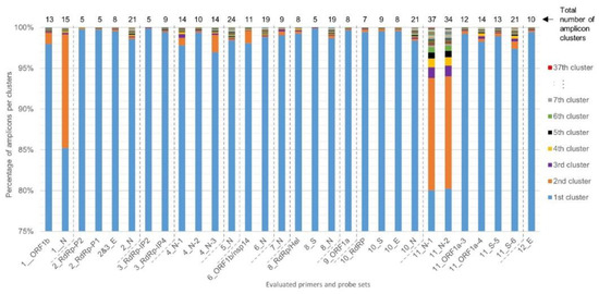 Diversity in the SARS-CoV-2 genomes of the target sequences amplified by the evaluated primer and probe sets. Clustering of the targeted genomic sequences amplified by the 30 evaluated primers was performed by SCREENED for each of the 12 RT-qPCR assays. The present chart shows the repartition of the amplicons from each genome in their sequence identity clusters (i.e., a set of targeted amplicons exhibiting exactly the same sequence), illustrating the overall sequence diversity according to the color key on the right of the figure for all primer and probe sets. For the majority of the assays, more than 97% of the amplicons were clustered in one large cluster. For Assay_1_N, Assay_11_N-1, and Assay_11_N-2, a second large cluster containing ~14% of the amplicons emerged. A varying amount of other clusters is present for the different methods, containing however only a very limited number of amplicons. Note that the y-axis, presenting the percentage of amplicons per cluster, starts at 75% to allow better the visual interpretation of amplicon diversity, since the first 75% always belongs to the first large cluster per primer and probe set.