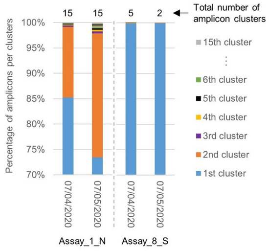 Similar to the first inclusivity evaluation, a clustering was performed by SCREENED of the amplicons generated by the primers and probe sets of Assay_1_N, exhibiting the worst inclusivity associated with a large diversity in the targeted sequence, and Assay_8_S, exhibiting the best inclusivity associated with targeting a highly conserved region (Section 2.2). The diversity in the targeted sequences amplified by the corresponding primers was compared between both batches of SARS-CoV-2 genomes. While the total number of amplicon clusters generated for Assay_1_N remained unchanged, the percentage of amplicons contained in the second cluster increased. The region targeted by Assay_8_S remained, however, highly conserved, with one large cluster containing almost all amplicons (Figure 4).