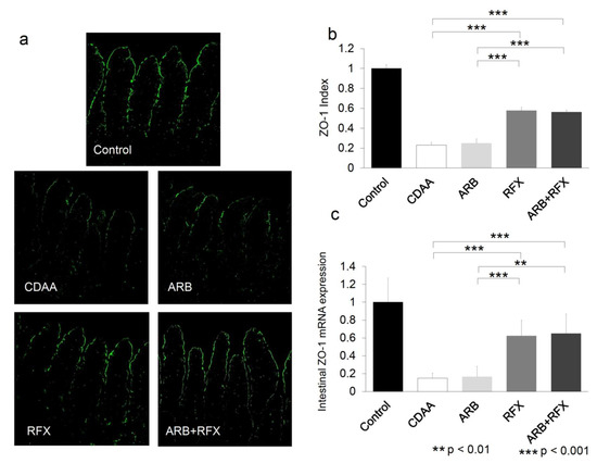Intestinal epithelial permeability is structured by intercellular TJP complexes comprised of various components that include ZO-1 or occludin. To identify the changes in intestinal permeability, we evaluated the effect of ARB and rifaximin on ZO-1 expression. The intestinal expression of ZO-1 was clearly observed on the apical side of the intestinal mucosa in control group (Figure 3a). Compared with control, CDAA showed a statistically significant decrease in ZO-1-positive areas and ZO-1 mRNA (p < 0.001). In contrast, ZO-1-positive areas and ZO-1 mRNA levels increased in RFX and ARB + RFX (p < 0.001). On the other hand, ARB showed no difference of ZO-1-positive areas and ZO-1 mRNA compared to CDAA (Figure 3).