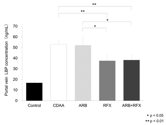 Evaluation of portal vein LPS-binding protein (LBP) concentration. LBP concentrations were significantly increased in the CDAA group compared to those in the control group. CDAA-induced increases in LBP concentration were significantly reduced in the RFX and ARB + RFX groups. No significant reduction in LBP concentration was observed in the ARB group. Values represent the mean ± SD. * p < 0.05, ** p < 0.01.