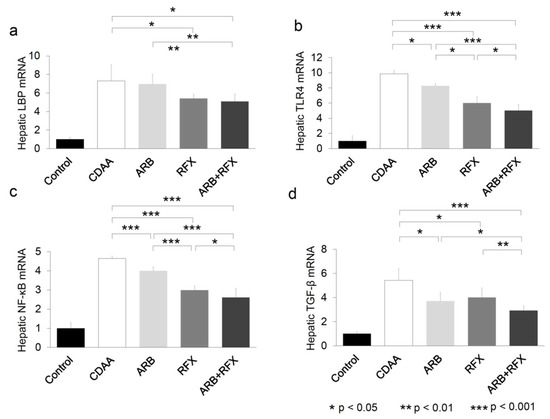 We evaluated the effect of both ARB and rifaximin on TLR4 mRNA expression of the liver. Hepatic gene expression of LBP was unchanged in CDAA and ARB, but decreased in the groups administered rifaximin (RFX, and ARB + RFX) (p < 0.05) (Figure 5a). The levels of TLR4, NF-κB, and TGF-β were significantly decreased in ARB and RFX, compared to CDAA and the levels were lowest in ARB + RFX (p < 0.001) (Figure 5b–d).