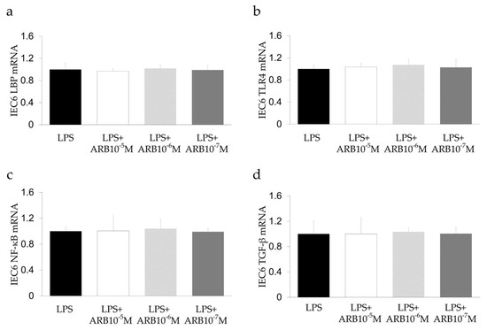 In vitro study of the effect of an ARB on intestinal epithelial cells using IEC-6. (a) LBP, (b) TLR4, (c) NF-kB, and (d) TGF-β. ARB did not influence IEC-6.