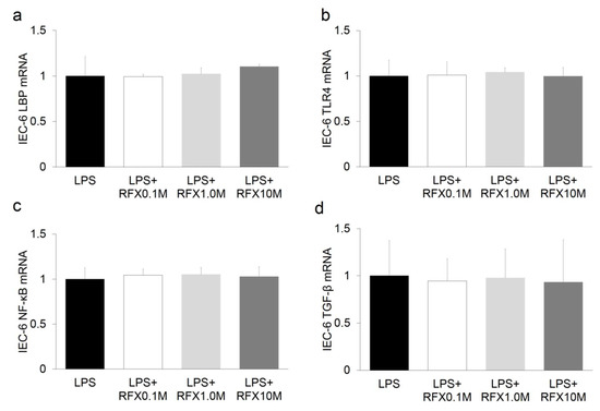 In vitro study of the effect of an RFX on intestinal epithelial cells using IEC-6. (a) LBP, (b) TLR4, (c) NF-kB, and (d) TGF-β.RFX did not influence IEC-6.
