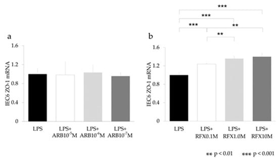 In vitro study of the ZO-1 expression on intestinal epithelial cells using IEC-6. (a) ARB, (b) RFX. ARB did not increase ZO-1. RFX increased ZO-1 expression in proportion to the LPS concentration. ** p < 0.01, *** p < 0.001.