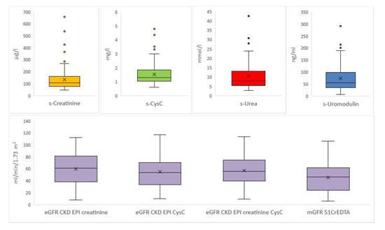 Boxplots for each parameter of glomerular filtration rate. Boxplots for serum creatinine concentration (s-Creatinine), serum cystatin C concentration (s-CysC), serum urea concentration (s-Urea), serum uromodulin concentration (s-Uromodulin), estimated glomerular filtration rate with Chronic Kidney Disease Epidemiology Collaboration study formula with s-Creatinine (eGFR CKD EPI creatinine), estimated glomerular filtration rate with Chronic Kidney Disease Epidemiology Collaboration study formula with s-CyC (eGFR CKD EPI CysC), estimated glomerular filtration rate with Chronic Kidney Disease Epidemiology Collaboration study formula with s-Creatinine and s-CysC (eGFR CKD EPI creatinine CysC), and measured glomerular filtration rate with Chromium-51-ethylenediaminetetraacetic acid clearance (mGFR 51CrEDTA).