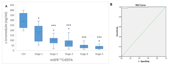 Uromodulin concentration in serum. (A) The boxplots for serum uromodulin concentration (s-Uromodulin) in chronic kidney disease of transplanted kidney (CKD-T) stages 1–5 based on measured GFR with 51CrEDTA (mGFR 51CrEDTA) (stage 1, n = 5; stage 2, n = 21; stage 3, n = 43; stage 4, n = 17; and stage 5, n = 11, with mGFR 51CrEDTA not possible to perform for 3 patients) in comparison to the control group (Ctrl); (B) ROC curve and AUC distinguishing CKD-T from the control group without any renal diseases. Legend: * p < 0.05, *** p < 0.001 (Ctrl versus Stage 1–5).