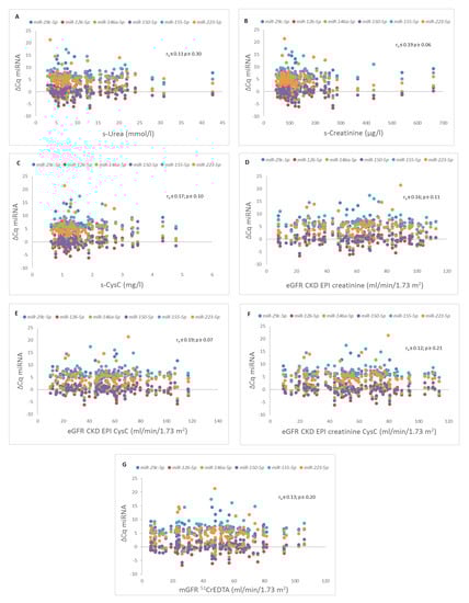 Correlations between different microRNAs (miRNAs) and parameters of kidney graft function. Correlation between different miRNAs and (A) serum urea concentration (s-Urea), (B) serum creatinine concentration (s-Creatinine), (C) serum cystatin C concentration (s-CysC), (D) estimated glomerular filtration rate with Chronic Kidney Disease Epidemiology Collaboration study formula with s-Creatinine (eGFR CKD EPI creatinine), (E) estimated glomerular filtration rate with Chronic Kidney Disease Epidemiology Collaboration study formula with s-CysC (eGFR CKD EPI CysC), (F) estimated glomerular filtration rate with Chronic Kidney Disease Epidemiology Collaboration study formula with s-Creatinine and s-CysC (eGFR CKD EPI creatinine CysC), (G) measured glomerular filtration rate with Chromium-51-ethylenediaminetetraacetic acid clearance (mGFR 51CrEDTA).