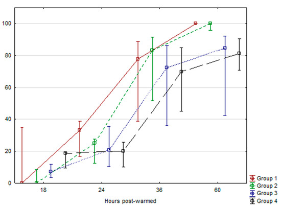 In order to assess the cryotolerance of in vitro produced embryos using l-carnitine, a total of 149 expanded blastocysts from all treatments were subjected to the vitrification process. After at least two weeks in liquid nitrogen, embryos were warmed and subsequently transferred to the incubator in culture media without l-carnitine. The recovery rate was 95.3% (142/149), and the reexpansion processes and hatching process were recorded during the following 18, 24, 36, and 60 h post-warming. The data did not fit a normal distribution. However, the reexpansion after warming was 100% in all treatments and the kinetics of embryonic hatching after warming post-vitrification was recorded (Figure 1). We did not find statistically significant differences (p > 0.05) between treatments at any time assessed.