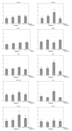 All mRNA transcripts were quantified using quantitative polymerase chain reaction (qPCR) and were run in the following conditions: 95 °C for 3 min, 35 cycles of 94 °C for 15 s, 56 °C for 30 s, and 72 °C for 15 s, followed by a final extension step for 10 s. Two replicates for all genes of interest were performed in the Rotorgene 6000 Real-Time Cycler TM (Corbett Research, Sydney, Australia) by adding a 2 mL aliquot of each sample to the PCR mix (QuantiTect SYBR Green PCR Kit, Qiagen, Germantown, MD, USA) containing the specific primers selected to amplify the genes of interest. The comparative cycle threshold (CT) method was used to quantify expression levels. The values were normalized to the endogenous controls (housekeeping gene—histone H2AFZ) [52,53]. According to the comparative CT method, the ΔCT value was determined by subtracting the HK mean CT value for each sample from each gene CT value of the sample. The calculation of ΔΔCT involved using the highest treatment ΔCT value, i.e., the treatment with the lowest target expression as an arbitrary constant to subtract from all other ΔCT sample values. Fold changes in the relative gene expression of the target were determined using the 2−ΔΔCT formula [54]. The primers used for the qPCR were as follows—H2A histone family, member Z (h2afz), long-chain fatty acid transport protein 4 (slc27a4), membrane transport protein associated with l-carnitine deficiency (slc22a5), Tumor protein p53 (tp53), Bcl-2-associated X protein (bax), SHC transformant protein 1 (shc1 shc), interferon tau (ifn-t), prostaglandin-endoperoxide synthase 2 (ptgs2), Placenta-specific gene 8 protein (plac8), and Diacyl glycerol transferase 1 and 2 (dgat1 and dgat2). The primer sequences and the approximate sizes of the amplified fragments of all the transcripts are shown in Table 3.