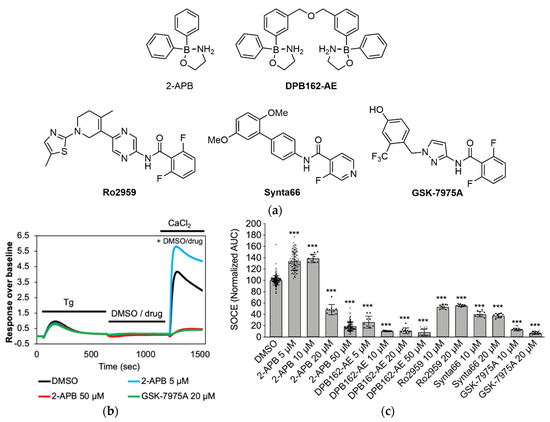 Reference compound Ro2925 was purchased from AK Scientific and DPB162-AE, Synta66 and GSK-7975A were resynthesized (Supplementary Materials) by adapting literature [54] and patent protocols [78,79]. The synthesis and spectroscopic characterization of 2-APB derivatives p-Me-2APB and p-I-2APB was reported previously [67].