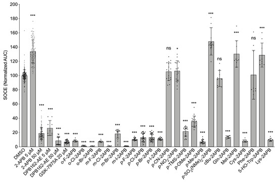 Screening of synthetic 2-APB analogues on SOCE in MDA-MB-231 cells using the FLIPR-based SOCE assay. Quantification of calcium influx after CaCl2 application (AUC), normalized to DMSO control (n ≥ 9 for all data points). Data shown are mean ± SD. All compounds were tested at 50 µM concentration, unless otherwise noted. Statistical significance compared to DMSO control is indicated as “***” for p ≤ 0.001, “*” for 0.01 < p ≤ 0.05 and “ns” not significant for p > 0.05.