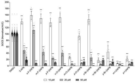When comparing the SOCE blocking effect at 10 µM compound concentration with the different halogen substituents at the same position, all ortho-halogenated derivatives did not block, but rather potentiated SOCE. For the meta- and para-positions, inhibiting potency increased with increasing size and decreasing electronegativity (m-F-2APB << m-Cl-2APB < m-Br-2APB < m-I-2APB and p-F-2APB << p-Cl-2APB < p-Br-2APB < p-I-2APB).